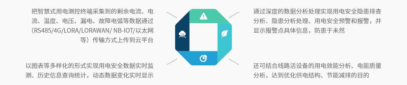 簡介: 智慧式用電安全隱患監管服務系統采用物聯網及大數據分析技術,全面采集電氣參量,不間斷的對引發電氣火災的主要因素(如漏電流過大、溫度異常過流、過欠壓、過載、不平衡等)進行數據跟蹤與統計分析,實時發現電氣線路和用電設備存在的安全隱患,分析用電用能情況,向安全管理人員發送預警信息,指導開展隱患治理、輔助運維工作,消除潛在的電氣火災危險,實現防患于未燃。